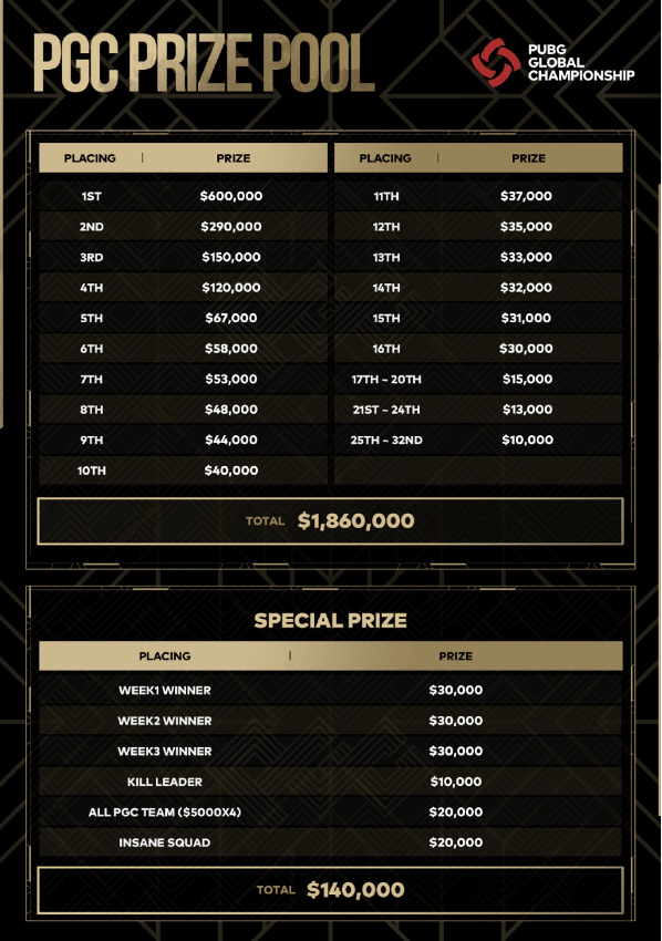 2021年PGC基础总奖金为200万美元,其中排名奖金共计186万美元,总冠军将独自包揽60万美元。此外,还有14万美元的特别奖励,每周周决赛冠军将获得3万美元奖金,淘汰榜的榜首将获得1万美元奖金,最佳阵容将授予系列赛中表现最佳的四名选手,每人获得5千美元奖金,最强小队将授予系列赛中表现最令人印象最深刻的队伍,并获得2万美元奖金。