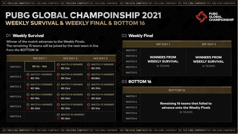 本次PGC 2021将从11月19日的排位赛开始,历经周中生存赛,周决赛,周末排位赛,总决赛资格赛,直到12月19日的总决赛结束。比赛的主赛场位于韩国仁川,除了PCL赛区的5支战队将在线上参赛,其余27支战队都将以线下形式参赛。比赛的赛事奖金总额高达200万美元,另外,PGC赛事专属道具销售纯收入的30%也将直接加入到奖金池中分给各支战队。
