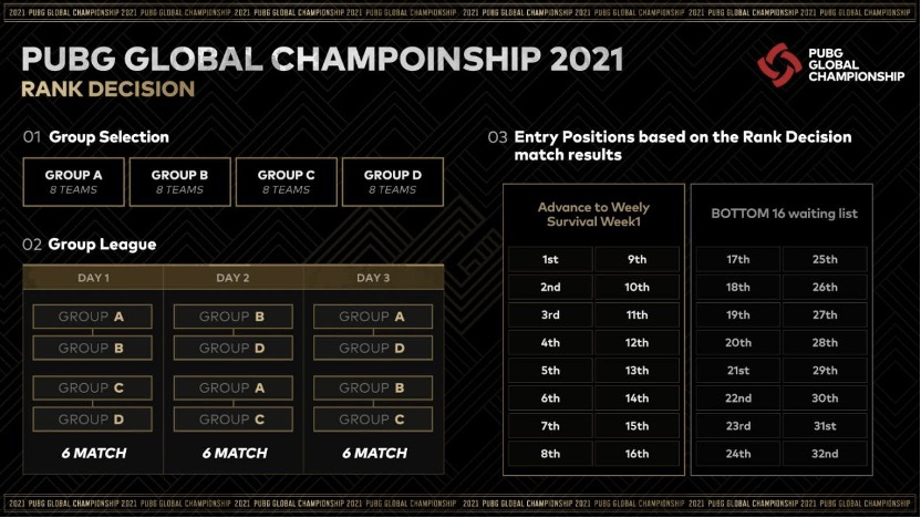 整个PGC 2021的序幕将由11月19日开始的排位赛拉开。32支战队被分成4个小组(分组情况见后文),通过3天的排位赛为即将到来的周中生存赛争夺参赛位置。排位赛采用积分赛制,即排名和淘汰数的积分统计。排位赛共进行3天,每天6场,排位赛的前16名将直接参加第一周的周中生存赛,17-31名则按照排名递补参加,第32名则无缘第一周的周中生存赛。