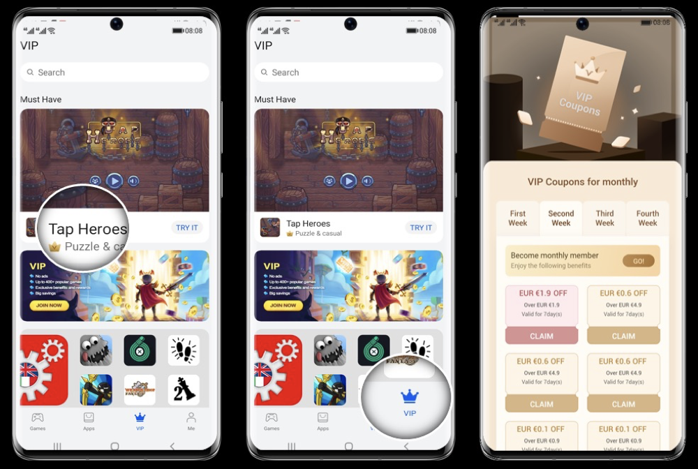 AppTouch VIP Service在客户端内设置了独立的一级入口,加入AppTouch VIP Service后的游戏将会展现在VIP专区中,享受更高的曝光量。同时在主页和应用详情页都有明显的VIP应用标识,以此提升订阅用户的体验感。AppTouch还会为订阅用户提供专属优惠券,用于其它非订阅游戏内的道具购买,以此来实现应用引流,刺激用户再消费。