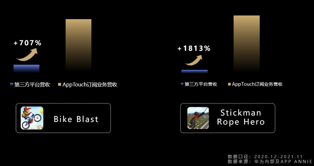 在实战案例方面,参考第三方平台数据及华为内部运营数据,游戏《Stickman Rope Hero》在加入了AppTouch会员联运后,从2020年12月至2021年11月近一年时间里,其营收增长了1813%;同期,另外一款名为《Bike Blast》的游戏,收入增长了707%,增收效果显著。
