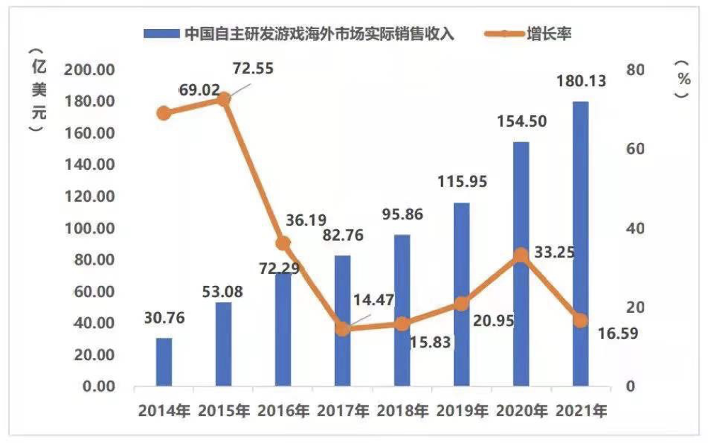 根据中国音数协游戏工委(GPC)与中国游戏产业研究院发布的《2021年中国游戏产业报告》显示,2021年中国自主研发游戏海外市场实际销售收入达180.13亿美元,比2020年增加了25.63亿美元,同比增长16.59%,国产手游在海外市场份额多年来一直稳步增长。