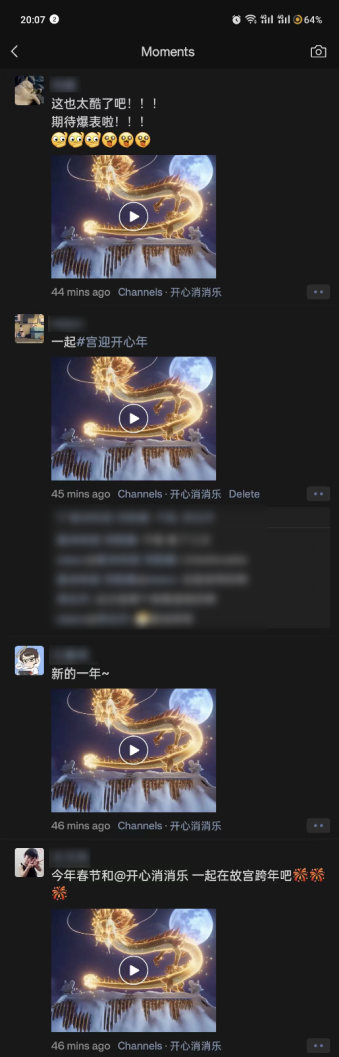 被《开心消消乐》的春节活动吸引住,始于它在朋友圈里疯传的CG短片。这只短片主要讲述了在知名网红宫猫帕帕的引领下,《开心消消乐》游戏里的7只小动物通过完成脊兽归位、写福字以及点亮宫灯的任务,收集宝珠唤醒神龙的故事。