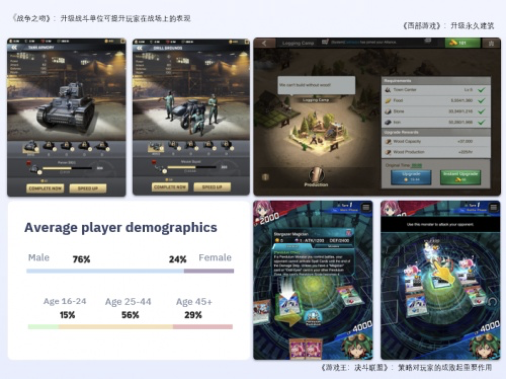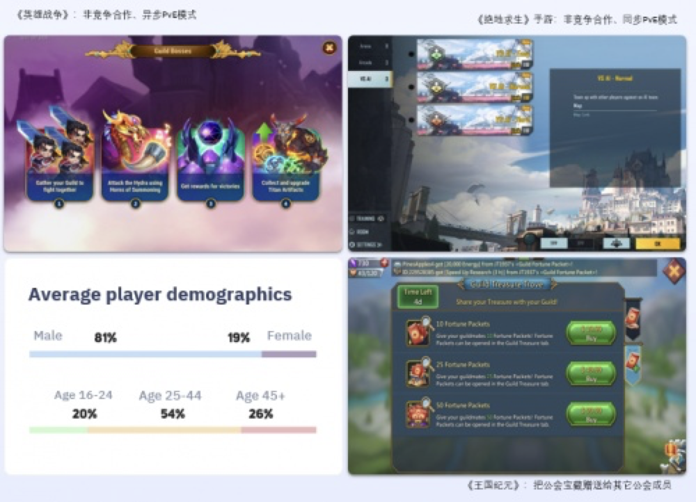 和他人进行非竞争的合作发展,例如公会奖励系统及合作玩法,通常会激励23-44岁、喜欢各种中核游戏的男玩家。此类中核游戏大多是SLG/4X策略游戏,但也包括吃鸡、多人战斗竞技场和战术射击游戏,这些游戏更注重基于反应的技能。享受相互合作的玩家也喜欢从其他玩家那里借用以及自己送出角色、道具、单位,从而体验团结一致的感觉。