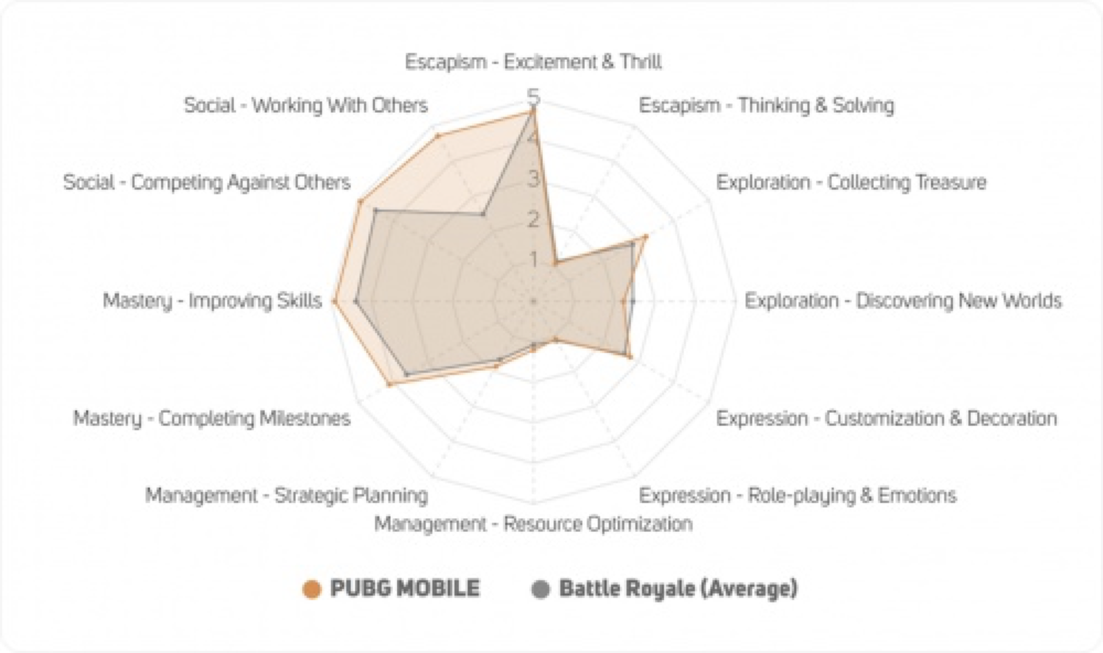 例如,我们的数据显示,《绝地求生》手游的受众喜欢与他人竞争,享受快节奏游戏玩法带来的兴奋和刺激,并希望通过提高自己的技能而获得提升。对某些玩家来说,这样的游戏正对口味,但对那些受“思考和解决问题”、“角色扮演”、“资源管理”等动机驱动的玩家来说,这可能不是他们的心头爱。