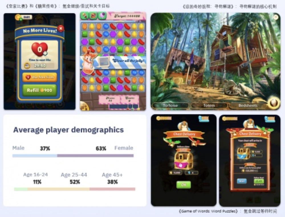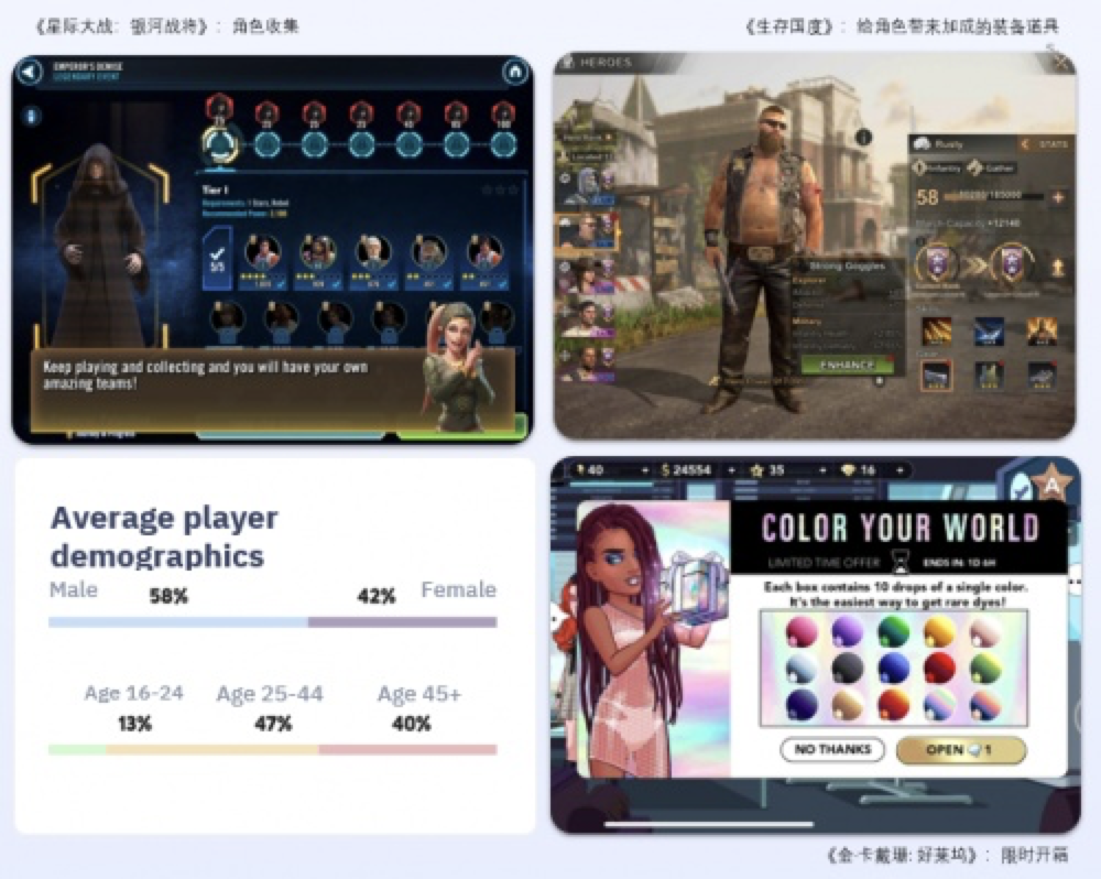 喜欢通过奖励、购买、合成、锻造来获得新道具和角色的玩家通常对传统的、以收集角色为基础的游戏类型感兴趣,如SLG/4X策略游戏或回合制角色扮演游戏(RPG)。不过,年轻玩家更喜欢以收集角色或稀有道具为核心的休闲游戏,如《宝可梦GO》或《金·卡戴珊: 好莱坞》。