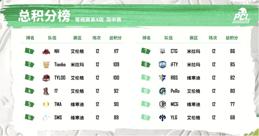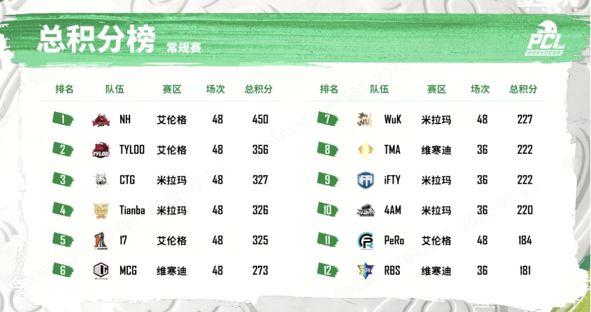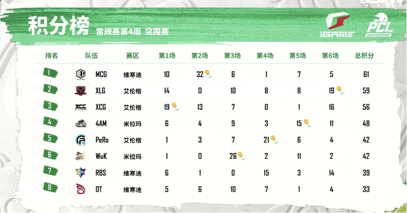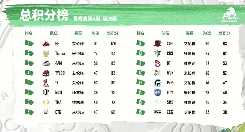 【Krafton Inc.旗下PUBG工作室】奋勇争先,龙吟四海!2022年绝地求生冠军联赛(PUBG CHAMPIONS LEAGUE,简称“PCL”)春季赛常规赛的第四周比赛已经结束。在最后的常规赛一周里,各路豪强战队吹响冲锋号角,冲击积分榜,挺进季后赛。让我们来关注下本周惊险刺激的榜单争夺赛果:NH战队全力出击,全员不遗余力以总数81个淘汰数,拿到126总积分甩开第二名领跑周决赛榜首;Tianba战队以72个淘汰数、114总积分紧跟其后,拿到周亚军;4AM战队后来居上,以56个淘汰数、85总积分力压TYLOO战队赢得周季军。17战队、MCG战队、CTG战队等传统豪强也名列前茅。