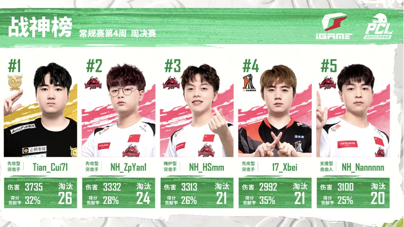 本周周决赛中,Tianba战队中Cui71选手表现抢眼,以单人高达3735的伤害、队伍32%的得分贡献率,拿下周决赛战神榜第一的位置;NH战队全员出击,ZpYan1选手、HSmm选手、Nannnnn选手以总伤害量接近一万的恐怖实力榜上有名,其中ZpYan1选手更是以2.8的KDA再次拿到本周常规赛的MVP。17战队的Xbei表现同样亮眼,以2992的伤害量、35%的得分贡献率和21个淘汰数,位于本周决赛战神榜的第四名。