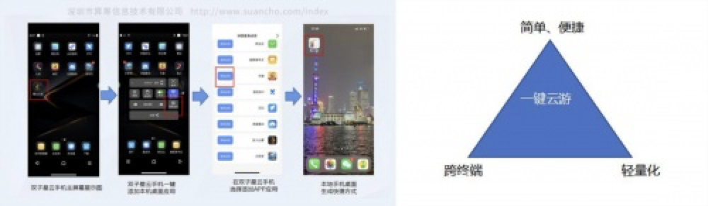 从云游戏原理来看:端游上云就是把游戏客户端放在云电脑里运行,再通过视频串流将游戏的视频画面与音频传到终端;从这一点上来看,手游上云其实也是将手游客户端装在云端手机实例中,再通过视频串流,将游戏画面与音频推出来。因此,对于用户而言,将手游安装在云手机上,即可自助实现手游上云,并且还能在云端进行游戏托管。双子星云手机有个特色功能,可以将装在云手机上的游戏应用,以快捷方式的形式生成在本地手机,用户使用时,点击本地桌面一个图标就可打开在云端运行的游戏。