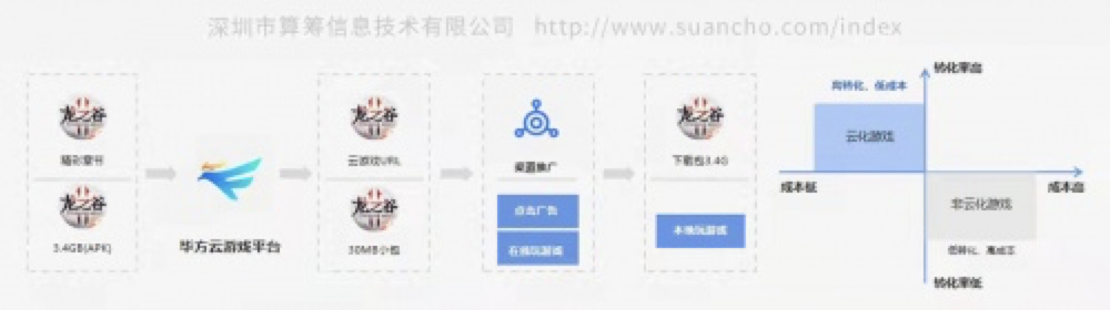 用户只需安装云化小包(或小程序、链接),以云网吧的方式进行游戏。根据其以往数据表明同类游戏,50MB包体的推广转化率约为600MB包体的一倍以上,渠道通过发行小包可有效提升转化率,降低买量获客成本。