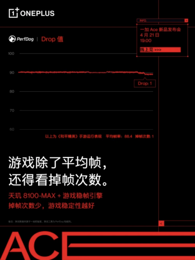 4月19日,一加手机宣布一加Ace将搭载HyperBoost游戏稳帧引擎,配合天玑8100-MAX独家定制芯片,为玩家们提供帧率至稳、掉帧次数少的畅快游戏体验,实力解决日常手机游戏遇到的痛点。