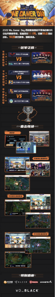 We. Gamer Day西部数据开黑挑战赛是由英雄联盟官方授权,西部数据旗下游戏品牌WD_BLACK打造的高校电竞赛事,2022新赛季新模式强势开团。自3月21日,春季赛率先在华西赛区、华东赛区以及华中赛区的111所高校启动,热血招募了96支战队,经过93场选拔赛和3场大区决赛的激烈争夺,最终3支战队——四川大学SUG战队、江西软件职业技术大学雀石队、湖北经济学院ST战队成功脱颖而出,分别获得三大赛区的冠军,接下来,他们将继续冲刺年度总冠军。