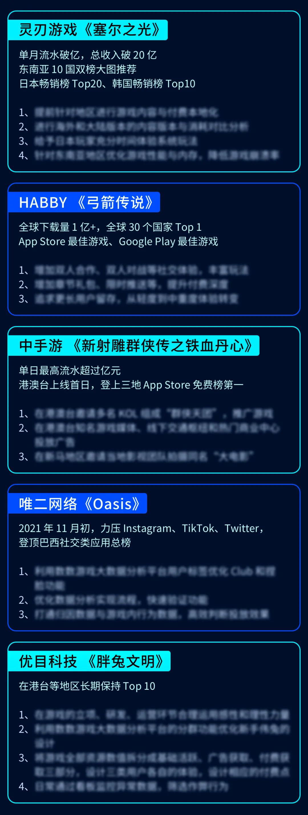 除以上,我们还根据多个爆款出海游戏项目组的采访分享,包括灵刃游戏《塞尔之光》、HABBY《弓箭传说》、中手游《新射雕群侠传之铁血丹心》、唯二网络《Oasis》、优目科技《胖兔文明》,梳理了他们的出海发行和运营思路,逐条列出,一并打包成了经验合集。从爆款中学习,到成为爆款。