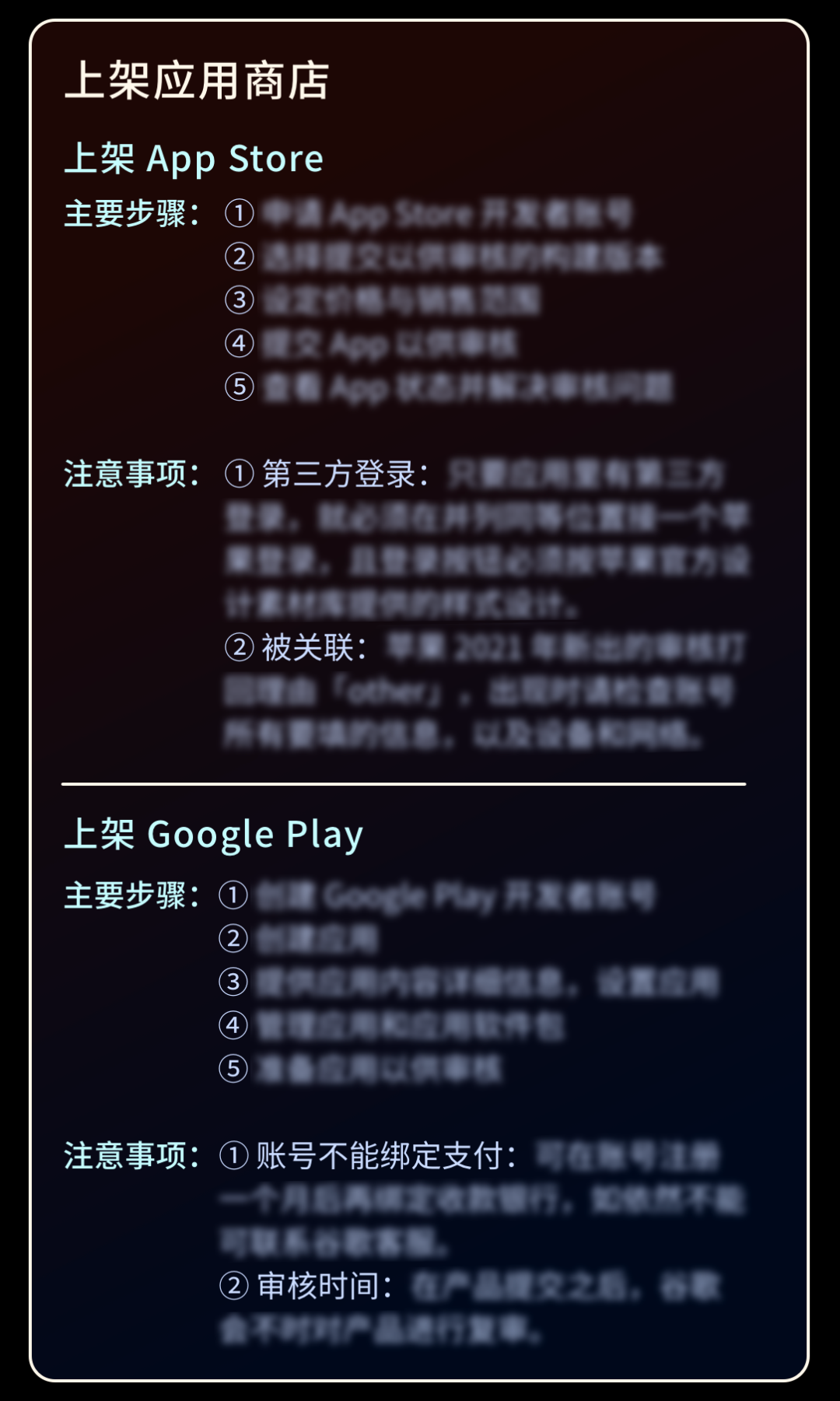 很多游戏开发者在出海过程中,产品在上架 App Store、Google Play 时可能都会遇到审核不通过被打回的情况,《游戏出海攻略》专门对比了上架 App Store、Google Play 的流程异同和注意事项,以及针对一些常见问题,如上架 App Store 的第三方登录和被关联问题,上架 Google Play 的账号绑定支付、多次不定期审核的问题等,给出了应对的方法。