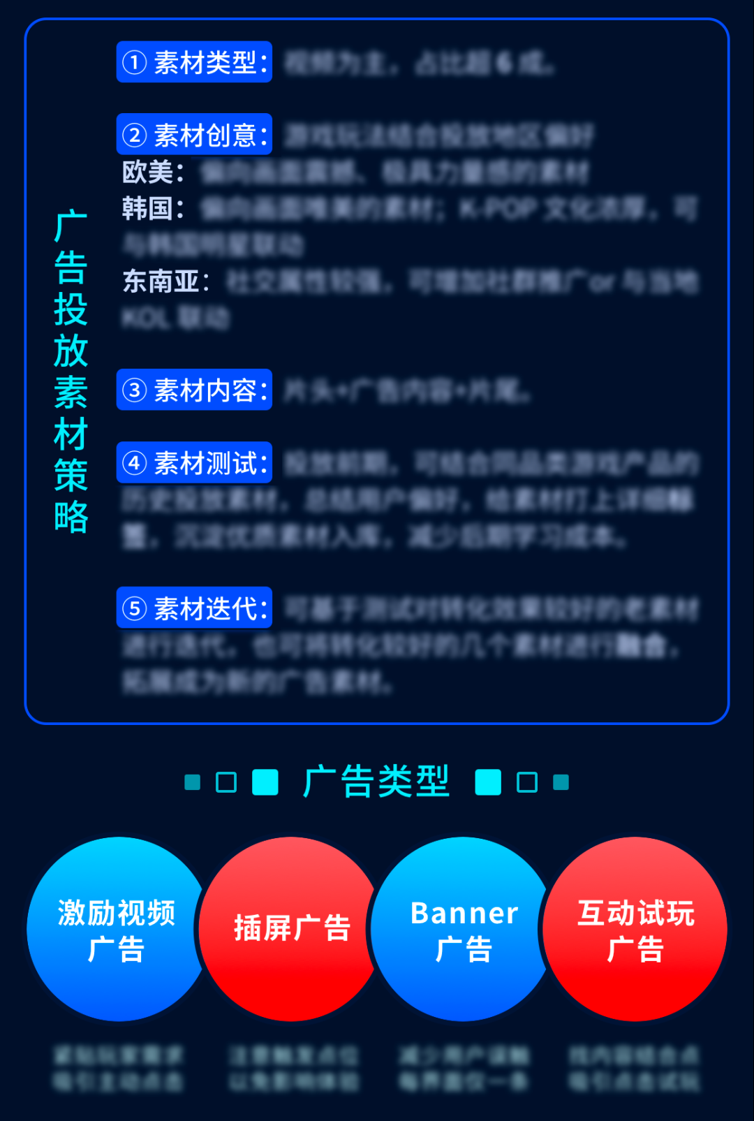 还有游戏出海的重中之重,买量!出海买量一直是厂商们面临的一大挑战,海外玩家与国内玩家的习惯、喜好不同,未经斟酌的买量方式难以被海外玩家接受,效果很难达到预期。攻略总结了四大类广告投放渠道,并从广告投放素材的类型、创意、内容、测试和迭代五大维度提供了策略,以及针对四大广告类型的点位设计要素提出了有效建议,辅助游戏出海攻克买量难题。