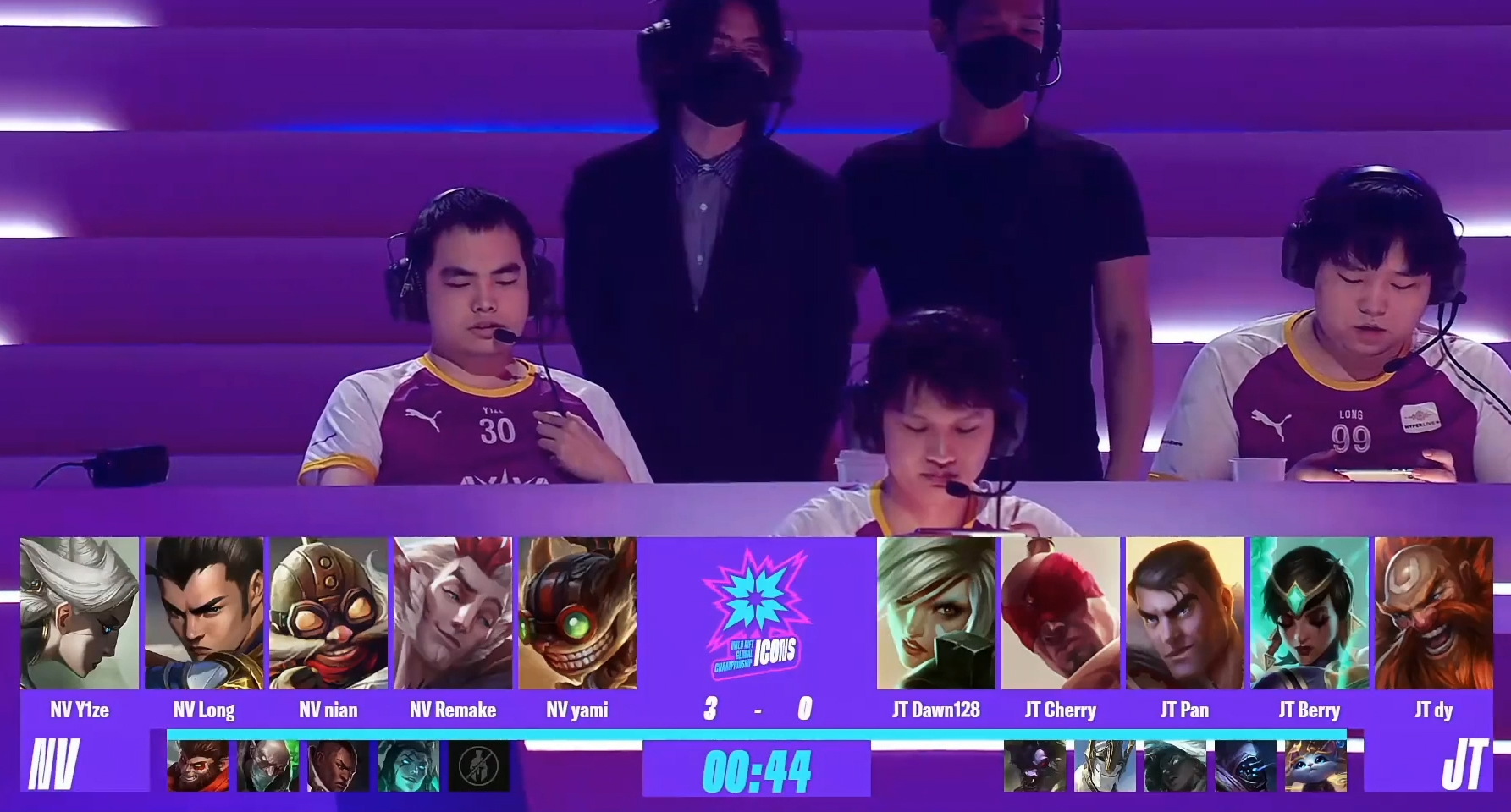 决胜局中,NV中路库奇开局拿下线杀顺势发育,积极进攻下半区,一波关键团战中打出0换4拿下小龙。中期多次在团战中抓住JT失误,一举攻上高地击破水晶!