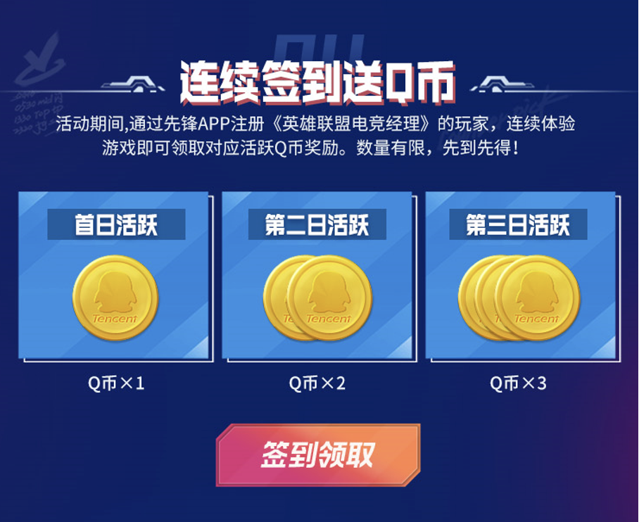 活动期间,通过腾讯先锋注册《英雄联盟电竞经理》的玩家还能参加签到领Q币活动。游戏首发3日内,前往活动页面进行签到即可领取对应天数的Q币奖励,完成3日签到最高能获得6Q币!需注意的是,Q币奖励数量有限,也是先到先得哦。