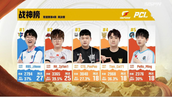本周RBS战队zHeee选手在周决赛两天的时间里展现十足的战斗力,力压NH战队的ZpYan1选手以27个淘汰数和37%得分贡献率夺得本周战神称号;NH战队的ZpYan1选手则是以3365的伤害值和39.5%得分贡献率回应粉丝们的期待,夺得战神榜第二的位置;本周周冠CTG战队的PaoPao选手以3040的伤害值和18个淘汰数排在战神榜第三;上周表现抢眼的Tianba战队Cui71选手本周以接近3000的伤害值和36.3%的得分贡献率排在第四,PeRo战队的Ming选手以2376的伤害值和30%的得分贡献率同样榜上有名。