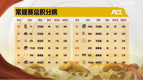 2022PCL夏季赛常规赛已然落幕,回顾本次常规赛:17战队依靠前两周势如破竹的冲劲,打下了十分珍贵的分数,并在后面的赛程中不断积累,最终以384分拿到常规赛的积分榜第一;NH战队尽管在常规赛前期有些乏力,不过及时地调整状态,向我们展现了春季赛冠军应有的实力,以331分获得常规赛第二名;CTG战队则是拿下了两周的周冠军,并且在只有36场比赛场次的情况下斩获288分,力压其它48场次的战队夺得常规赛积分榜第三名。