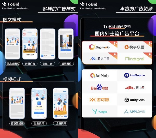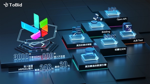 ToBid聚合以专业的技术基因优势和深厚的行业经验背景为依托,通过聚合多个平台广告资源以及智能精准的分配策略,为开发者提供真实、透明、全面的数据服务,致力于进一步提升变现效率,实现广告收益最大化。