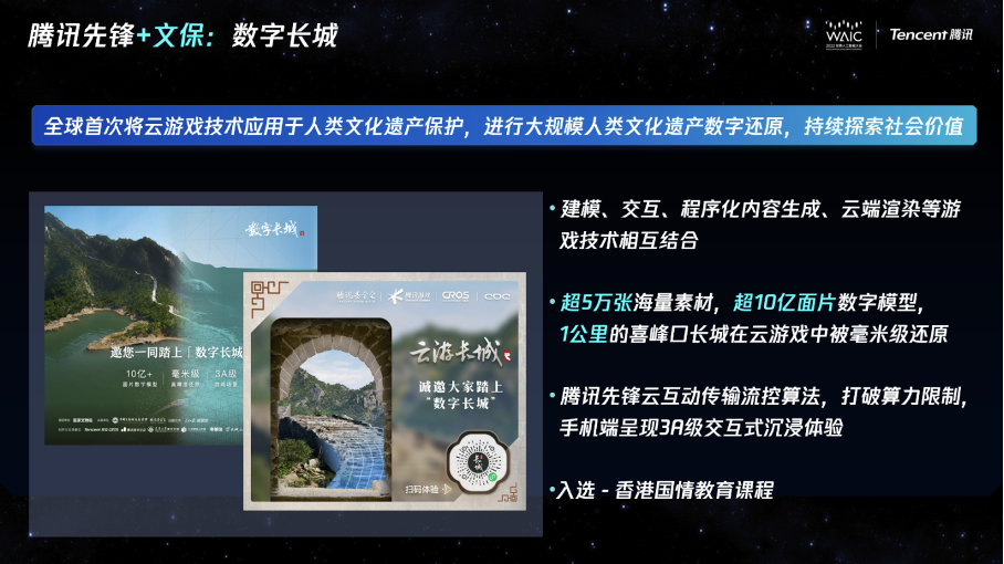 为满足亿万级用户在线游览“数字长城”需要,技术团队通过“云游戏传输流控算法”,实现了手机等移动端呈现3A级的观看效果和交互体验。这是全球首次将云游戏技术应用于人类文化遗产保护,而云游戏的相关技术则正是来自腾讯先锋云游戏。