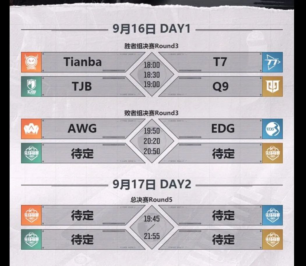 9月16日18:00-20:50,赛事将进行胜、败双组决赛,决出胜者组前2名战队、败者组前2名战队晋级先锋杯赛总决赛。胜者组决赛中,Q9、Tianba、T7、TJB将通过一轮Round3对决,选拔晋级总决赛的前2名战队。败者组决赛中,将由AWG、EDG两支战队与胜者组决赛后2名战队通过一轮Round3对抗再决高下,最后前2名战队同样将晋级总决赛!