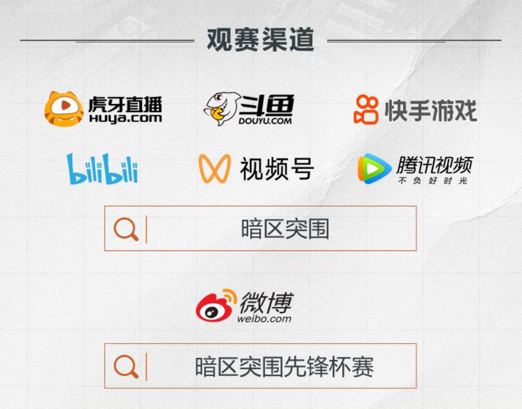 赛事进行期间,各位观赛先锋可在视频号、快手游戏、腾讯视频平台搜索“暗区突围赛事”、在虎牙直播、斗鱼平台搜索“暗区突围”、或在微博搜索“暗区突围先锋杯赛”?观看赛事。
