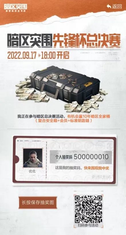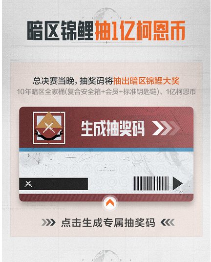 总决赛巅峰之夜将于9月17日18点-22点开启,多重惊喜内容等各位先锋前来解锁!人气主播集结出击,干翻暗区策划,现场将抽取1亿柯恩币(分10人获得);制作人加盟现场,爆料新版本玩法内容。决赛期间,各位更有机会赢取10年暗区全家桶(复合安全箱+会员+标准钥匙链)、实体金铭牌、iPhone13等丰厚福利,千万不要错过!