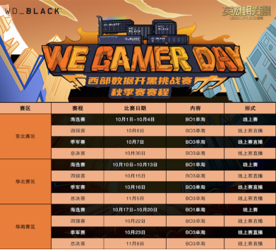 2022We. Gamer Day西部数据开黑挑战赛秋季赛将在东北赛区、华北赛区、华南赛区进行公开招募,三大赛区的高校同学可以通过H5报名页面,以战队为单位进行报名参赛。