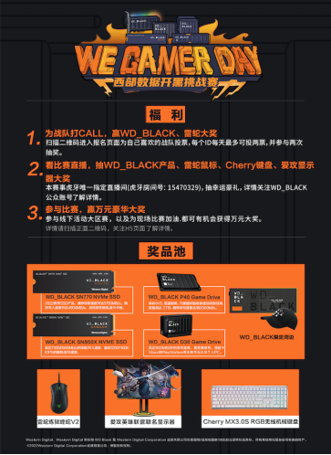 四强赛开始将在虎牙西部数据专属直播间(房间号:15470329)进行线上赛直播,看直播参与线上抽奖,奖品丰富,WD_BLACK产品、雷蛇鼠标、Cherry键盘、爱攻显示器。