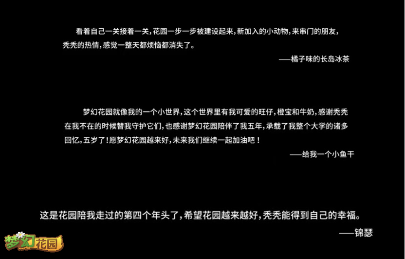 如果说整部微电影的内容是温馨的陪伴与感谢,那最后的玩家彩蛋,就是最令人感动的真情回应。整部短片最后,放出了在《梦幻花园》玩家社区Fanbook以及微博上征集到的玩家真实祝福,方方面面都让人感受到五年以来玩家对于《梦幻花园》的爱与支持。