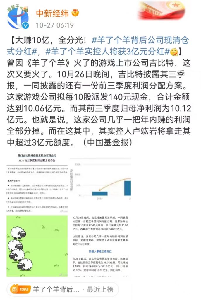 事件起因在于今天早上6:19,财经媒体「中新经纬」发布了一篇微博,并带上#羊了个羊背后公司现清仓式分红#的tag,其中提到了吉比特前三季度的盈利情况及分红情况。从博文结构及用语来看,似乎《羊了个羊》的爆火为吉比特带来了十分可观的收益。
