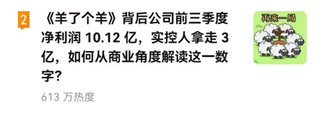 微博上对吉比特分红情况的爆发式关注(当然《羊了个羊》在其中贡献了极高的关注度)也辐射到了其他媒介。关于该事件的讨论在知乎一跃成为热榜第二,热度高达613万。