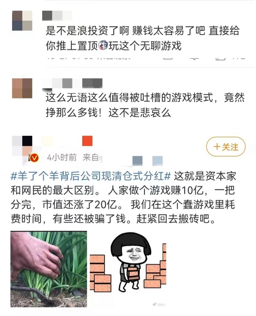“得益于”这篇博文,该微博话题下的不少网友认为《羊了个羊》让吉比特“赚麻了”,这钱挣得“好悲哀”,甚至还有身为某研究所首席市场分析师的红V发布了“做个游戏赚10亿”的言论,让我一时间分不清究竟谁更悲哀......