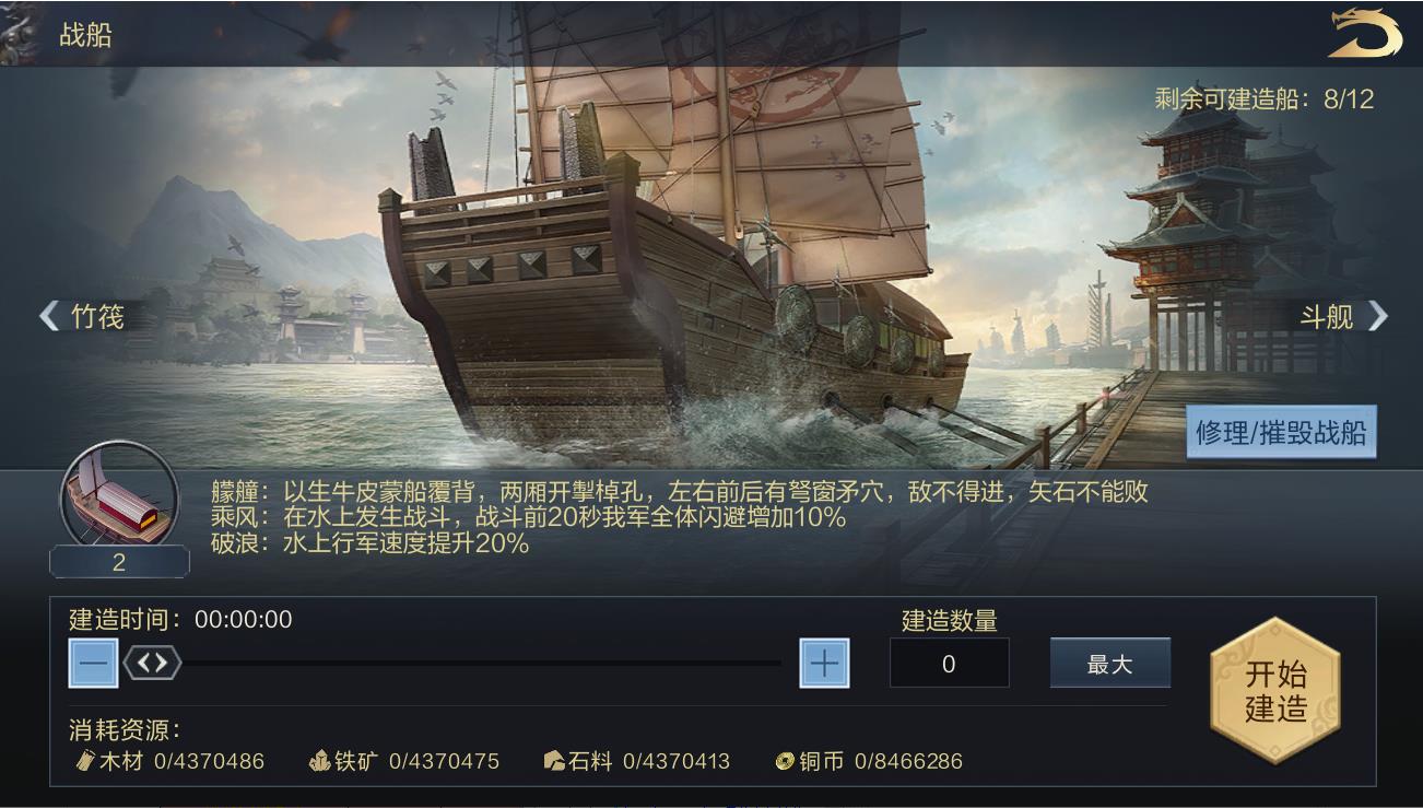 基于这两点考量,制作组便赋予艨艟战船“乘风”与“破浪”两个特性,前者可以为船上军队提供生存能力,后者则能加快行军速度。而其他船型,斗舰的设计则更为平坦,适合士兵进行对决和战斗;楼船通过装载丰富的器械,对应的攻城能力也在技能中体现。