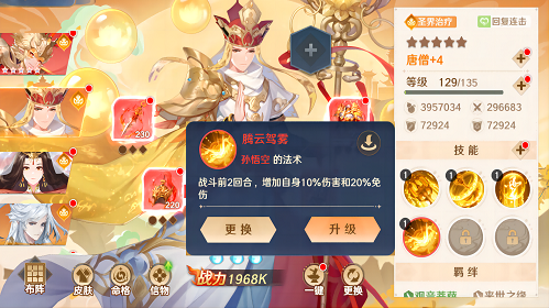 《自在西游》设定了法术系统、命格系统、信物系统等养成玩法,尤其是法术系统,支持玩家将抽到的重复角色转化成为具有特殊效果的“法术技能”,自由装配给任意角色,且每个角色可以装备至多3个法术技能。这一设计使得游戏的策略性大大提升,甚至给予了唐僧这样的奶妈型角色转型成为暴力输出的机会!