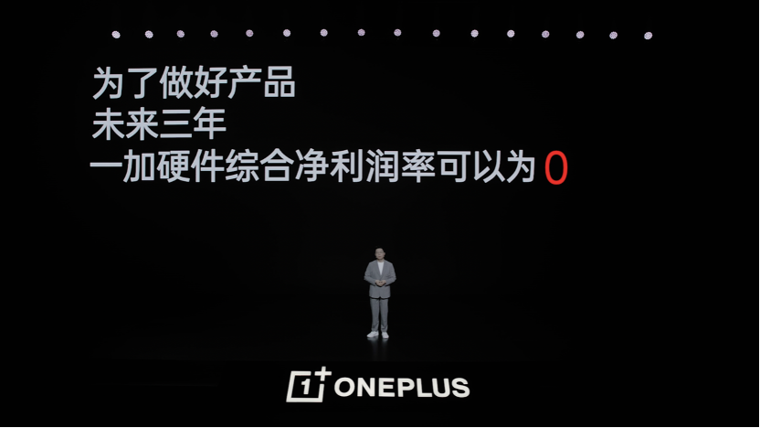 一加中国区总裁李杰在周年庆上表示,一加未来依旧专注做好产品,OPPO投入的 100 亿资金将主要用于产品研发,以打造兼具极致性能和质感设计,拥有旗舰体验的精品。为了做好产品,一加敢在利润率上做出让步,李杰表示:“我们有信心也有决心,就是要不惜成本做好产品,未来三年,一加产品的硬件综合净利润率可以为 0 。”