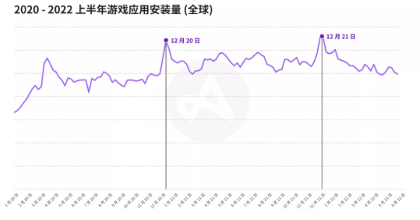 让我们一起看看移动游戏在Q5的最新数据。2020和2021年,全球游戏应用的安装量高峰都出现在12月,而2021年1月和2022年1月则在当年安装排行榜中名列第二。