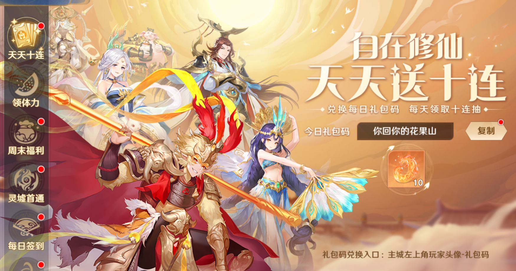 第三重福利——“天天十连送终生”!这是《自在西游》为大家准备的终极大礼,每位玩家进入游戏后只需达到5级,就能每天领取到10连抽福利,天天送十连,终生不间断,一年3650抽,助你实现抽卡自由!