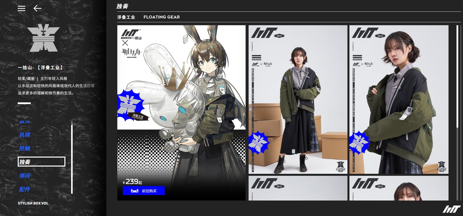 而另外一边,鹰角也在20年年底注册属于自家的“一拾山”衣装品牌。得益于同属鹰角旗下可以背靠游戏IP的优势,“一拾山”在服装设计上有意往《明日方舟》内的人物服饰风格靠近。在官网中我们可以看到一拾山也是毫不避讳地在商品旁贴上“阿米娅”的人物图,有意表现出衣服品牌与游戏品牌之间的关联。