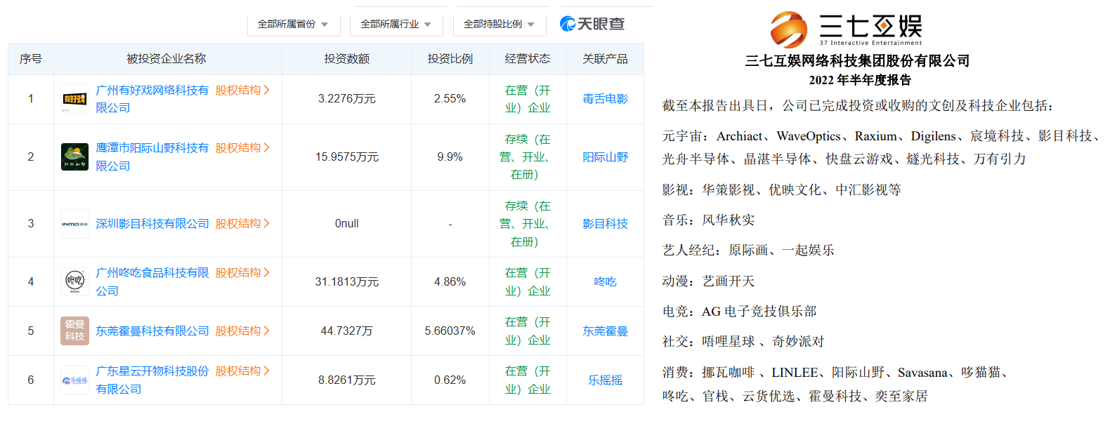 无独有偶,积极布局非游戏产业的公司当然不止贪玩一家。如果说贪玩是专攻速食、潮玩两大产业吃到甜头的厂商,那么三七互娱(以下简称三七)就是广撒网多敛鱼的典型代表。