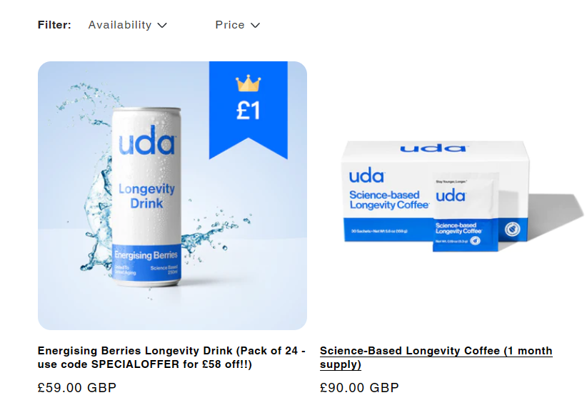 有着这般噱头的UDA自然要在产品上下足功夫。根据官网显示,这款饮品加入了例如槲皮素、α-酮戊二酸、L-茶氨酸、烟酰胺单核苷酸等七种抗衰老成分,有效发挥抗衰老的作用。