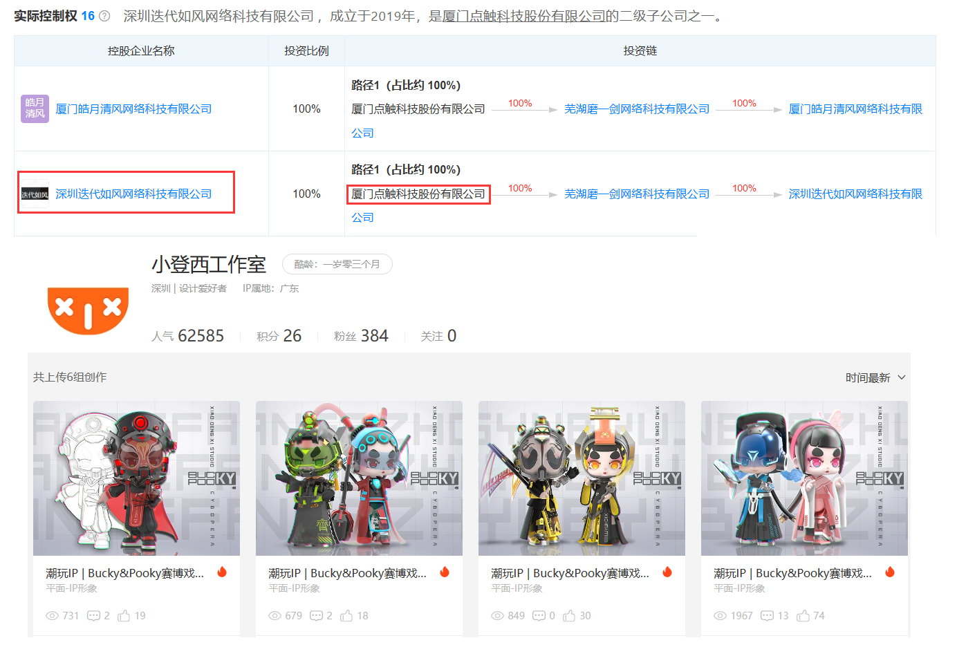 除了创梦天地这类潮玩老字号外,在近期点触科技也通过全资子公司迭代如风推出自家的潮玩品牌“小登西”。
