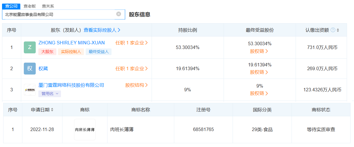 似乎是对食品产业情有独钟,除了猫粮元更元外,我们还在新锐肉制品品牌“肉班长”股东信息中看到了雷霆的身影。