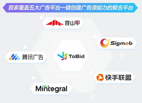 目前ToBid成为业内首家具备覆盖国内腾讯广告、快手联盟、穿山甲、Sigmob、Mintegral五大广告平台一键创建广告源能力的聚合平台。