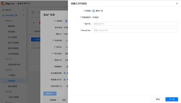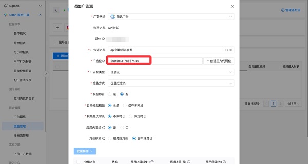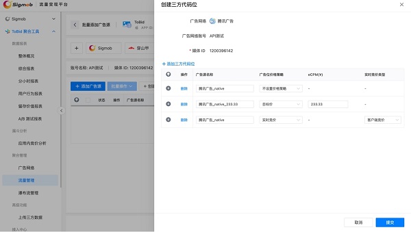 开发者仅需在 ToBid聚合平台填写相关参数一个步骤,即可一键实现三方底价或竞价代码位的创建,并绑定至 ToBid聚合平台,极大简化运营流程提升效率。