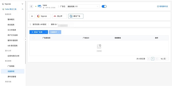 首先,开发者登陆至 ToBid平台,点击任意【+添加广告源】按钮,即可进入功能页面。