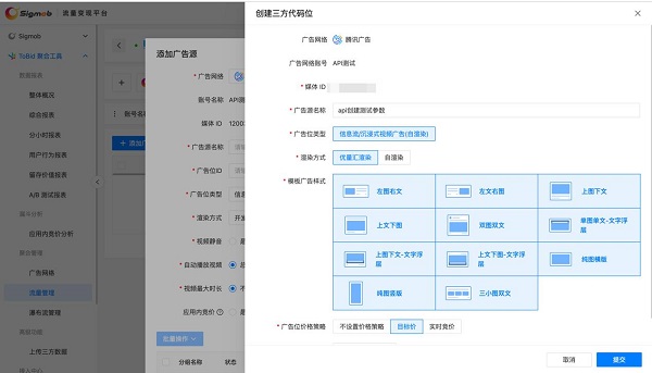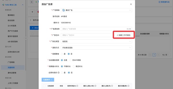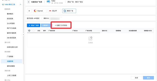 点击【+添加广告源】按钮后,在弹出的二级页面,用户可看到【+创建三方代码位】按钮,点击此按钮即可使用 API创建三方代码位功能。