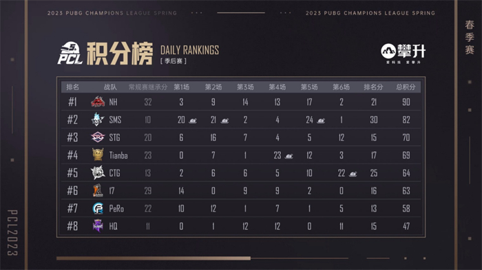 NH战队在春季赛开赛以来就以极强的火力制霸战场,高额的继承分也让他们在季后赛中颇有竞争力:季后赛首日,尽管没有成功吃鸡,但是凭借队里MMing选手和ZpYan1选手的得分能力,NH战队依旧处于榜首位置;随后在第三天第五局的比赛里,NH战队面对同样满编的CCG战队,双方展开激烈的互换,NH战队近点冲锋和远点狙击相互配合,成功淘汰对手拿到季后赛首鸡;第四天第三局七阶段,随着圈中心大混战,NH战队先是淘汰4AM战队,随后集火淘汰仅剩一人的CTG战队,再次吃鸡。此时积分NH再次完成登顶;最后一天冠军争夺战,第三局七阶段蓝圈收缩,NH战队占住优势位置淘汰HQ战队,此时对手仅剩下Tianba战队独狼,NH战队4人以合围之势将其淘汰成功吃鸡,再次争得榜首位置。无奈最后两局圈运不佳,没能拿到很好的得分机会,最终以261分荣获亚军!