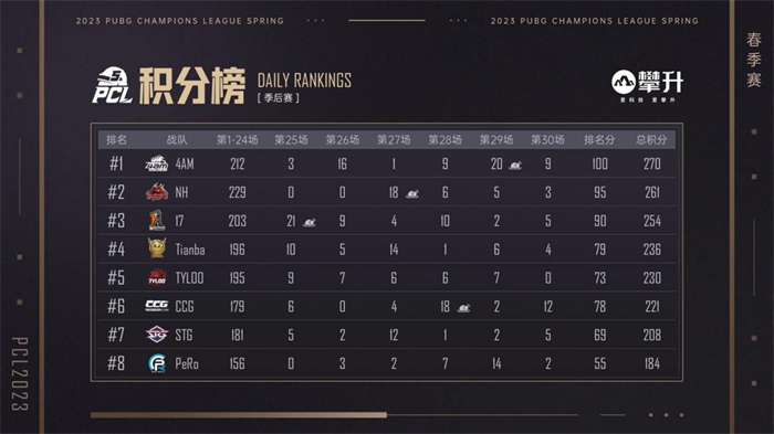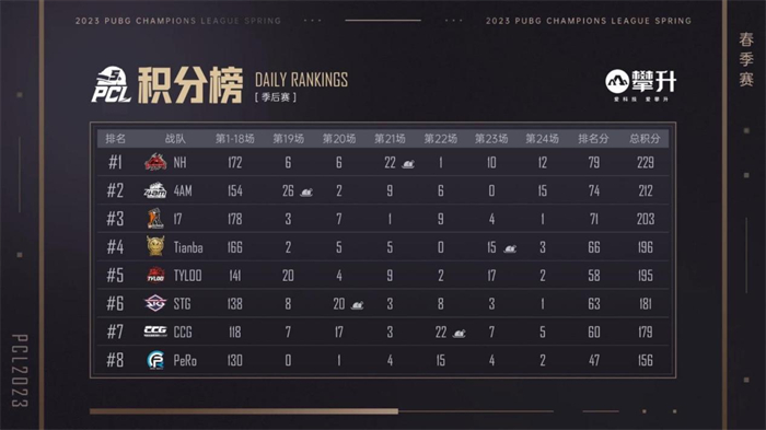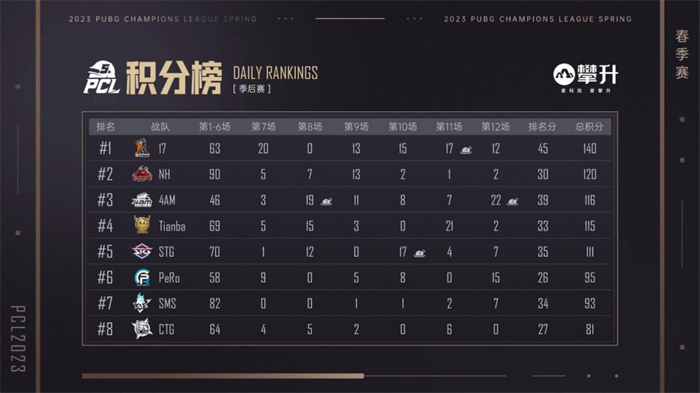 第五比赛日:本日为争冠之日,4AM战队、17战队、NH战队争先恐后,其队伍积分也交替领先,将冠军归属悬念留在了最后一刻。随着第二局CTG战队的吃鸡,17战队以233分排在榜首,仅仅只高出4AM战队两分,而排在第三的NH战队也只是落后17战队4分;同时Tianba战队和TYLOO战队以同样211分队榜首虎视眈眈。而后,4AM战队凭借在倒数第二局的吃鸡成功反超登顶榜首,此时距离夺冠只差临门一脚,好在最后一局的时候,4AM战队以舍我其谁的勇气闯进决赛圈得分,成功超越继承分多他们一倍之余的NH战队和17战队,登顶PCL2023春季赛冠军,可谓是强者造天命!